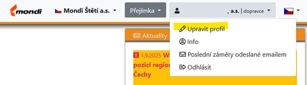 Heslo pro mobilní aplikaci lze nastavit ve webové aplikaci kliknutím na název společnosti v pravém horním rohu a výběrem položky Upravit profil. Tato možnost je dostupná pouze v případě, že se přihlašujete pomocí svého admin hesla. Pokud toto heslo neznáte, požádejte společnost Wood&Paper o zaslání odkazu, prostřednictvím kterého si můžete nastavit nové heslo i heslo admin.